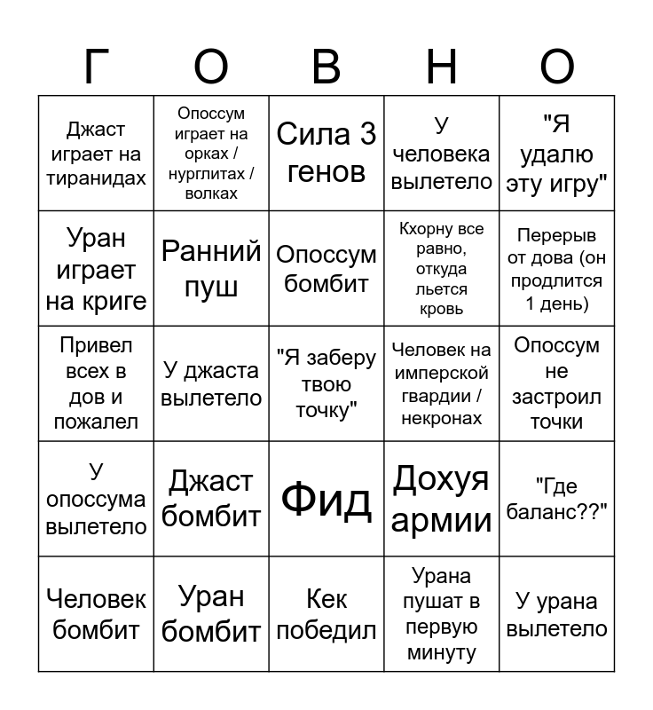 This bingo card has a free space and 24 words: Джаст бомбит, Уран бомбит, Опоссум бомбит, Человек бомбит, "Я удалю эту игру", Джаст играет на тиранидах, Уран играет на криге, Опоссум играет на орках / нурглитах / волках, Человек на имперской гвардии / некронах, Фид, Кхорну все равно, откуда льется кровь, Привел всех в дов и пожалел, Дохуя армии, "Где баланс??", Ранний пуш, Урана пушат в первую минуту, Опоссум не застроил точки, Сила 3 генов, Перерыв от дова (он продлится 1 день), У джаста вылетело, У урана вылетело, У опоссума вылетело, У человека вылетело and Кек победил.