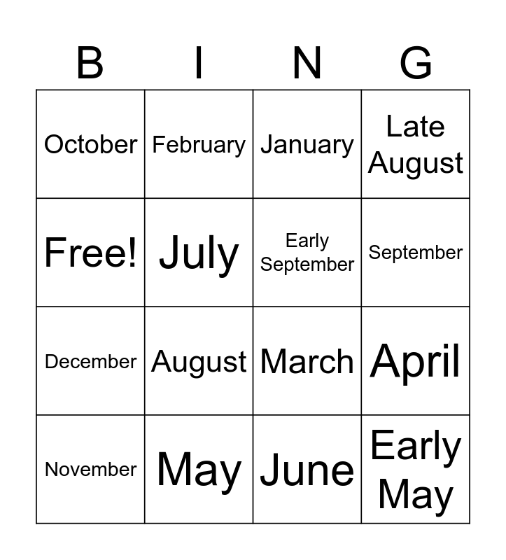 This bingo card has 16 words: May, April, January, October, December, February, March, June, Free!, July, November, Late August, August, September, Early September and Early May.
