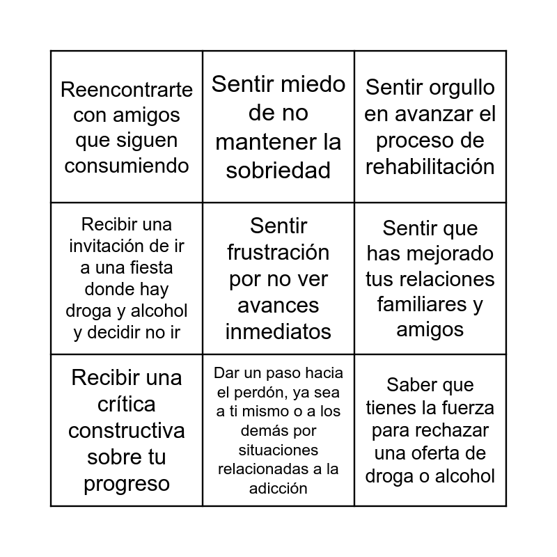 This bingo card has a free space and 8 words: Sentir que has mejorado tus relaciones familiares y amigos, Sentir orgullo en avanzar el proceso de rehabilitación, Sentir miedo de no mantener la sobriedad, Recibir una crítica constructiva sobre tu progreso, Reencontrarte con amigos que siguen consumiendo, Saber que tienes la fuerza para rechazar una oferta de droga o alcohol, Recibir una invitación de ir a una fiesta donde hay droga y alcohol y decidir no ir and Dar un paso hacia el perdón, ya sea a ti mismo o a los demás por situaciones relacionadas a la adicción.