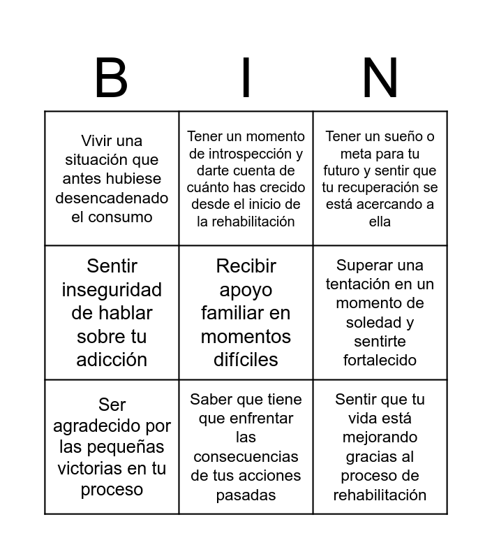 This bingo card has a free space and 8 words: Superar una tentación en un momento de soledad y sentirte fortalecido, Tener un sueño o meta para tu futuro y sentir que tu recuperación se está acercando a ella, Tener un momento de introspección y darte cuenta de cuánto has crecido desde el inicio de la rehabilitación, Ser agradecido por las pequeñas victorias en tu proceso, Vivir una situación que antes hubiese desencadenado el consumo, Sentir que tu vida está mejorando gracias al proceso de rehabilitación, Sentir inseguridad de hablar sobre tu adicción and Saber que tiene que enfrentar las consecuencias de tus acciones pasadas.