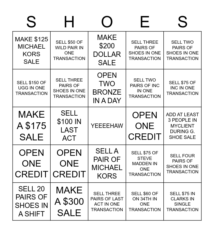 This bingo card has a free space and 24 words: OPEN ONE CREDIT, MAKE A $300 SALE, OPEN TWO BRONZE IN A DAY, SELL 20 PAIRS OF SHOES IN A SHIFT, SELL TWO PAIRS OF SHOES IN ONE TRANSACTION, MAKE $125 MICHAEL KORS SALE, SELL $150 OF UGG IN ONE TRANSACTION, SELL $50 OF WILD PAIR IN ONE TRANSACTION, OPEN ONE CREDIT, SELL A PAIR OF MICHAEL KORS, SELL TWO PAIRS OF INC IN ONE TRANSACTION, MAKE A $175 SALE, SELL $75 OF STEVE MADDEN IN ONE TRANSACTION, SELL FOUR PAIRS OF SHOES IN ONE TRANSACTION, SELL THREE PAIRS OF SHOES IN ONE TRANSACTION, SELL $60 OF ON 34TH IN ONE TRANSACTION, ADD AT LEAST 3 PEOPLE IN MYCLIENT DURING G. SHOE SALE, MAKE $200 DOLLAR SALE, SELL $75 OF INC IN ONE TRANSACTION, SELL $100 IN LAST ACT, SELL $75 IN CLARKS IN SINGLE TRANSACTION, OPEN ONE CREDIT, SELL THREE PAIRS OF SHOES IN ONE TRANSACTION and SELL THREE PAIRS OF LAST ACT IN ONE TRANSACTION.