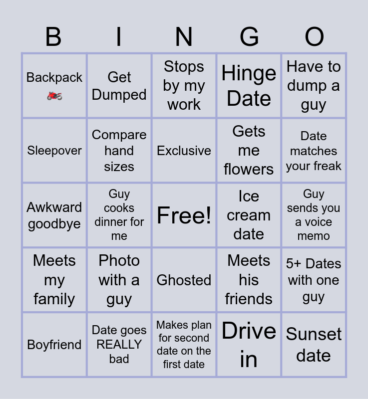 This bingo card has a free space and 29 words: Boyfriend, Meets my friends, Guy cooks dinner for me, Go on a date with a man met in the wild, Backpack🏍, Stops by my work, Compare hand sizes, Photo with a guy, Ice cream date, Date goes REALLY bad, Guy sends you a voice memo, Sunset date, Makes plan for second date on the first date, Drive in, Date matches your freak, Gym date, Ghosted, Meets my family, Have to dump a guy, Awkward goodbye, Meets his friends, Hike date, Gets me flowers, Sleepover, Hinge Date, Get Dumped, 5+ Dates with one guy, Exclusive and Picks me up.