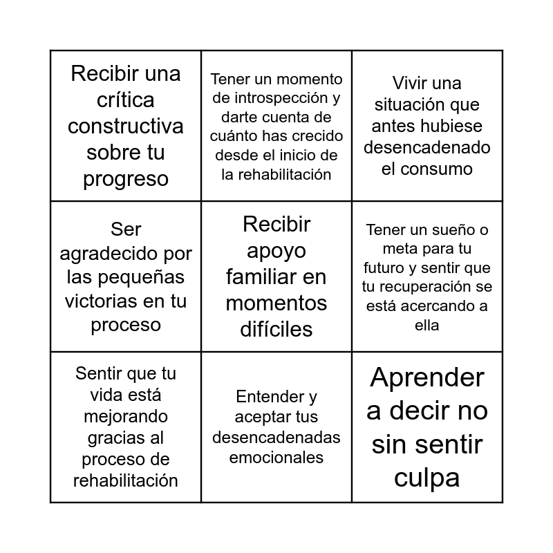 This bingo card has a free space and 8 words: Ser agradecido por las pequeñas victorias en tu proceso, Tener un momento de introspección y darte cuenta de cuánto has crecido desde el inicio de la rehabilitación, Tener un sueño o meta para tu futuro y sentir que tu recuperación se está acercando a ella, Sentir que tu vida está mejorando gracias al proceso de rehabilitación, Vivir una situación que antes hubiese desencadenado el consumo, Recibir una crítica constructiva sobre tu progreso, Entender y aceptar tus desencadenadas emocionales and Aprender a decir no sin sentir culpa.