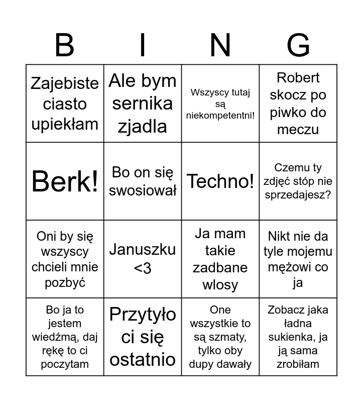 This bingo card has 16 words: Przytyło ci się ostatnio, Nikt nie da tyle mojemu mężowi co ja, Wszyscy tutaj są niekompetentni!, Zajebiste ciasto upiekłam, Oni by się wszyscy chcieli mnie pozbyć, Ale bym sernika zjadla, Ja mam takie zadbane wlosy, One wszystkie to są szmaty, tylko oby dupy dawały, Berk!, Bo on się swosiował, Bo ja to jestem wiedźmą, daj rękę to ci poczytam, Robert skocz po piwko do meczu, Januszku <3, Czemu ty zdjęć stóp nie sprzedajesz?, Techno! and Zobacz jaka ładna sukienka, ja ją sama zrobiłam.