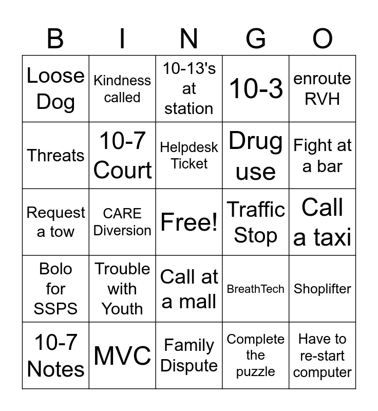 This bingo card has a free space and 24 words: Trouble with Youth, MVC, Helpdesk Ticket, 10-7 Notes, enroute RVH, Loose Dog, Threats, Kindness called, Traffic Stop, Call at a mall, Drug use, Request a tow, BreathTech, Shoplifter, 10-7 Court, Complete the puzzle, Call a taxi, 10-13's at station, Fight at a bar, CARE Diversion, Have to re-start computer, Bolo for SSPS, 10-3 and Family Dispute.