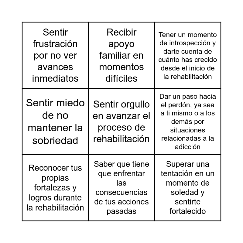 This bingo card has a free space and 8 words: Dar un paso hacia el perdón, ya sea a ti mismo o a los demás por situaciones relacionadas a la adicción, Tener un momento de introspección y darte cuenta de cuánto has crecido desde el inicio de la rehabilitación, Recibir apoyo familiar en momentos difíciles, Reconocer tus propias fortalezas y logros durante la rehabilitación, Sentir frustración por no ver avances inmediatos, Superar una tentación en un momento de soledad y sentirte fortalecido, Sentir miedo de no mantener la sobriedad and Saber que tiene que enfrentar las consecuencias de tus acciones pasadas.