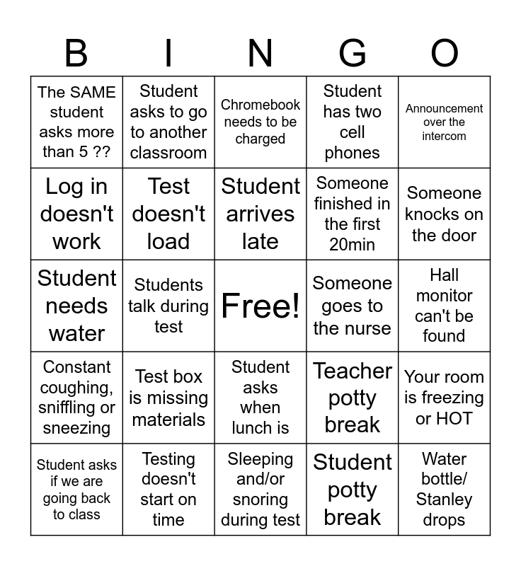 This bingo card has a free space and 24 words: Test box is missing materials, Testing doesn't start on time, Student arrives late, Student asks if we are going back to class, Announcement over the intercom, The SAME student asks more than 5 ??, Log in doesn't work, Student asks to go to another classroom, Someone goes to the nurse, Student asks when lunch is, Someone finished in the first 20min, Student needs water, Teacher potty break, Your room is freezing or HOT, Test doesn't load, Student potty break, Hall monitor can't be found, Chromebook needs to be charged, Someone knocks on the door, Students talk during test, Water bottle/ Stanley drops, Constant coughing, sniffling or sneezing, Student has two cell phones and Sleeping and/or snoring during test.