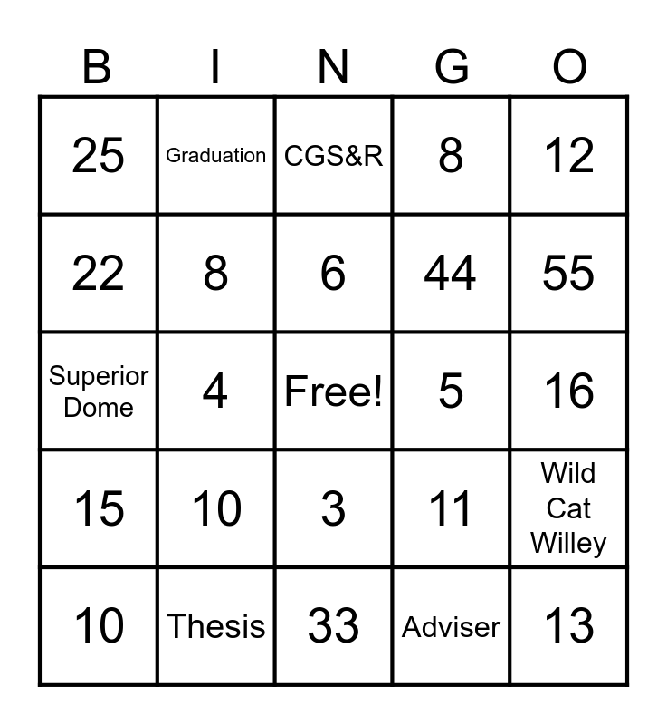 This bingo card has a free space and 39 words: 2, 4, 6, 8, 10, 3, 6, 9, 12, 15, 4, 8, 13, 16, 5, 10, 20, 25, 30, 11, 22, 33, 44, 55, Dean Eckert, The Famous Tyler T!, Rule Maker Janelle T!, Ruler Breaker Kelly L!, Never Laughs, Sarah A!, Graduation, GPA, GAship, CGS&R, Thesis, Adviser, NMU, Wild Cat Willey, Superior Dome and Go Wildcats!!!.