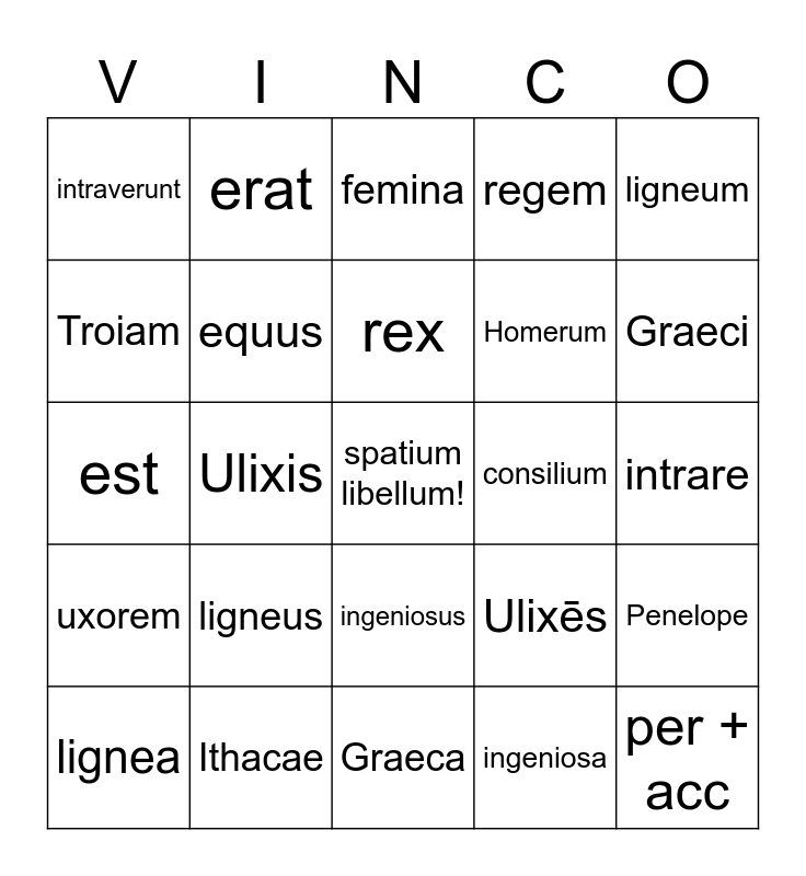 This bingo card has a free space and 36 words: Graecus, obsederunt, Troia, equus, Ulixēs, uxorem, rex, Homerus, ligneum, equum, Ulixis, regem, decem annos, consilium, Graeci, intraverunt, Ithaca, ligneus, per + acc, femina, intrare, Penelope, Ithacae, lignea, Graeca, erat, est, obsidebant, Homerum, Troiam, poeta, uxor, ingeniosa, ingeniosus, Penelopen and septem annos.