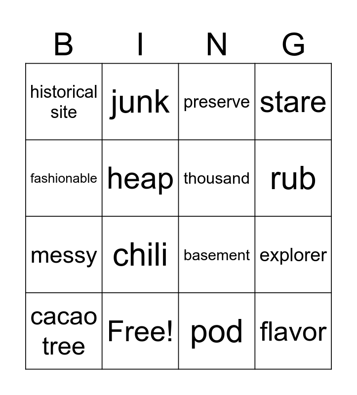 This bingo card has 30 words: century, document, explorer, civilization, historical site, preserve, thousand, mosaic, Free!, bean, pod, cacao tree, vanilla, cinnamon, chili, bitter, fake, flavor, currency, fashionable, basement, chilly, junk, messy, heap, stare, scan, layer, rub and reveal.