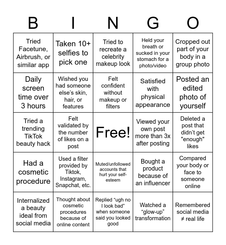 This bingo card has a free space and 24 words: Used a filter provided by Tiktok, Instagram, Snapchat, etc., Thought about cosmetic procedures because of online content, Felt confident without makeup or filters, Internalized a beauty ideal from social media, Cropped out part of your body in a group photo, Tried Facetune, Airbrush, or similar app, Daily screen time over 3 hours, Taken 10+ selfies to pick one, Viewed your own post more than 3x after posting, Muted/unfollowed accounts that hurt your self-esteem, Satisfied with physical appearance, Tried a trending TikTok beauty hack, Bought a product because of an influencer, Compared your body or face to someone online, Wished you had someone else’s skin, hair, or features, Watched a “glow-up” transformation, Deleted a post that didn’t get "enough" likes, Tried to recreate a celebrity makeup look, Posted an edited photo of yourself, Felt validated by the number of likes on a post, Remembered social media ≠ real life, Had a cosmetic procedure, Held your breath or sucked in your stomach for a photo/video and Replied “ugh no I look bad” when someone said you looked good.
