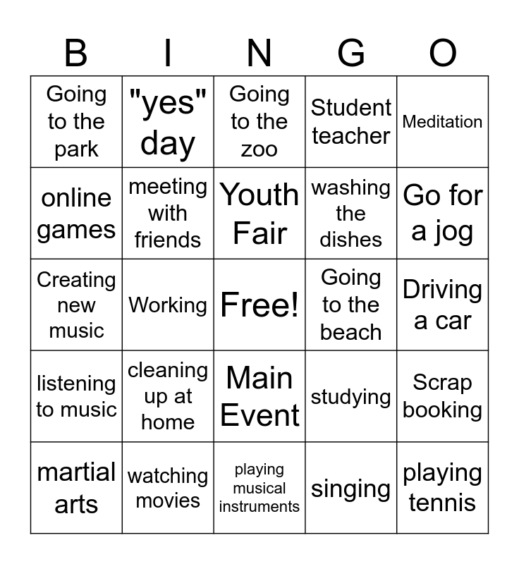 This bingo card has a free space and 29 words: martial arts, making art, Working, Building something, Going to the park, Going to the zoo, meeting with friends, cleaning up at home, Going to the beach, watching movies, Driving a car, playing tennis, playing musical instruments, singing, Go for a jog, indoor fun park, Main Event, listening to music, Meditation, Creating new music, studying, sleeping, washing the dishes, online games, Student teacher, "yes" day, Scrap booking, Youth Fair and Newspaper clippings.