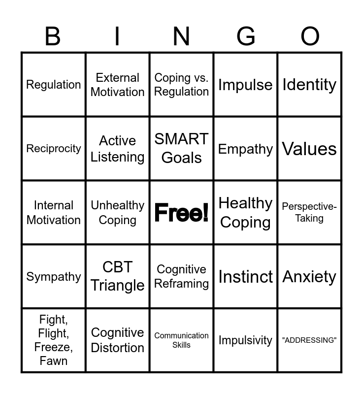 This bingo card has a free space and 24 words: CBT Triangle, Cognitive Distortion, SMART Goals, Fight, Flight, Freeze, Fawn, Identity, Regulation, Reciprocity, External Motivation, Healthy Coping, Cognitive Reframing, Empathy, Internal Motivation, Instinct, Anxiety, Active Listening, Impulsivity, Perspective-Taking, Coping vs. Regulation, Values, Unhealthy Coping, "ADDRESSING", Sympathy, Impulse and Communication Skills.