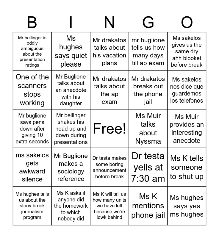 This bingo card has a free space and 24 words: Mr Buglione makes a sociology reference, Ms K asks if anyone did the homework to which nobody did, Mr drakatos talks about the ap exam, Ms hughes tells us about the stony brook journalism program, Ms sakelos gives us the same dry ahh blooket before break, Mr bellinger is oddly ambiguous about the presentation ratings, One of the scanners stops working, Ms hughes says quiet please, Ms Muir talks about Nyssma, Dr testa makes some boring announcement before break, Mr drakatos breaks out the phone jail, Mr buglione says pens down after giving 10 extra seconds, Dr testa yells at 7:30 am, Ms K tells someone to shut up, Mr Buglione talks about an anecdote with his daughter, Ms K mentions phone jail, Ms Muir provides an interesting anecdote, Mr drakatos talks about his vacation plans, Ms sakelos nos dice que guardemos los telefonos, Mr bellinger shakes his head up and down during presentations, Ms hughes says yes ms hughes, ms sakelos gets awkward silence, mr buglione tells us how many days till ap exam and Ms K will tell us how many units we have left because we’re lowk behind.