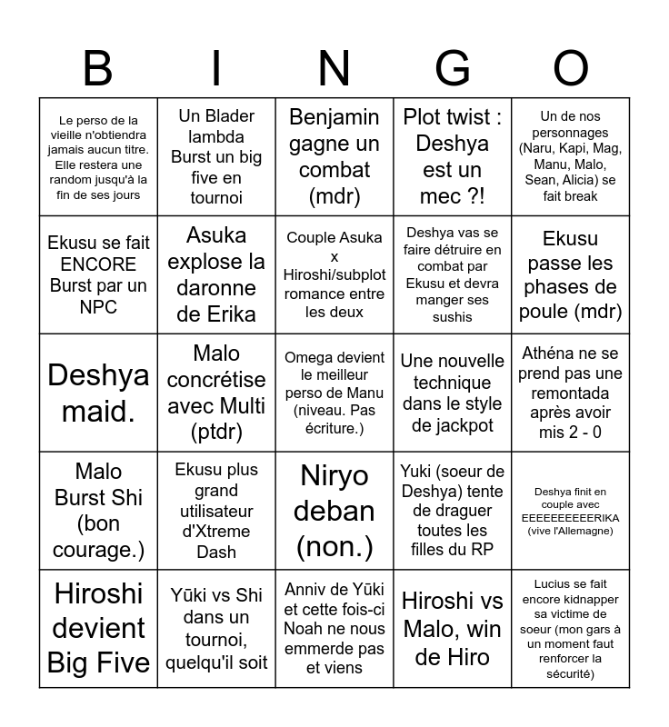 This bingo card has a free space and 24 words: Ekusu plus grand utilisateur d'Xtreme Dash, Yūki vs Shi dans un tournoi, quelqu'il soit, Couple Asuka x Hiroshi/subplot romance entre les deux, Hiroshi devient Big Five, Un de nos personnages (Naru, Kapi, Mag, Manu, Malo, Sean, Alicia) se fait break, Le perso de la vieille n'obtiendra jamais aucun titre. Elle restera une random jusqu'à la fin de ses jours, Ekusu se fait ENCORE Burst par un NPC, Un Blader lambda Burst un big five en tournoi, Une nouvelle technique dans le style de jackpot, Niryo deban (non.), Deshya vas se faire détruire en combat par Ekusu et devra manger ses sushis, Deshya maid., Yuki (soeur de Deshya) tente de draguer toutes les filles du RP, Deshya finit en couple avec EEEEEEEEEERIKA (vive l'Allemagne), Asuka explose la daronne de Erika, Hiroshi vs Malo, win de Hiro, Athéna ne se prend pas une remontada après avoir mis 2 - 0, Benjamin gagne un combat (mdr), Ekusu passe les phases de poule (mdr), Malo concrétise avec Multi (ptdr), Lucius se fait encore kidnapper sa victime de soeur (mon gars à un moment faut renforcer la sécurité), Malo Burst Shi (bon courage.), Plot twist : Deshya est un mec ?! and Anniv de Yūki et cette fois-ci Noah ne nous emmerde pas et viens.