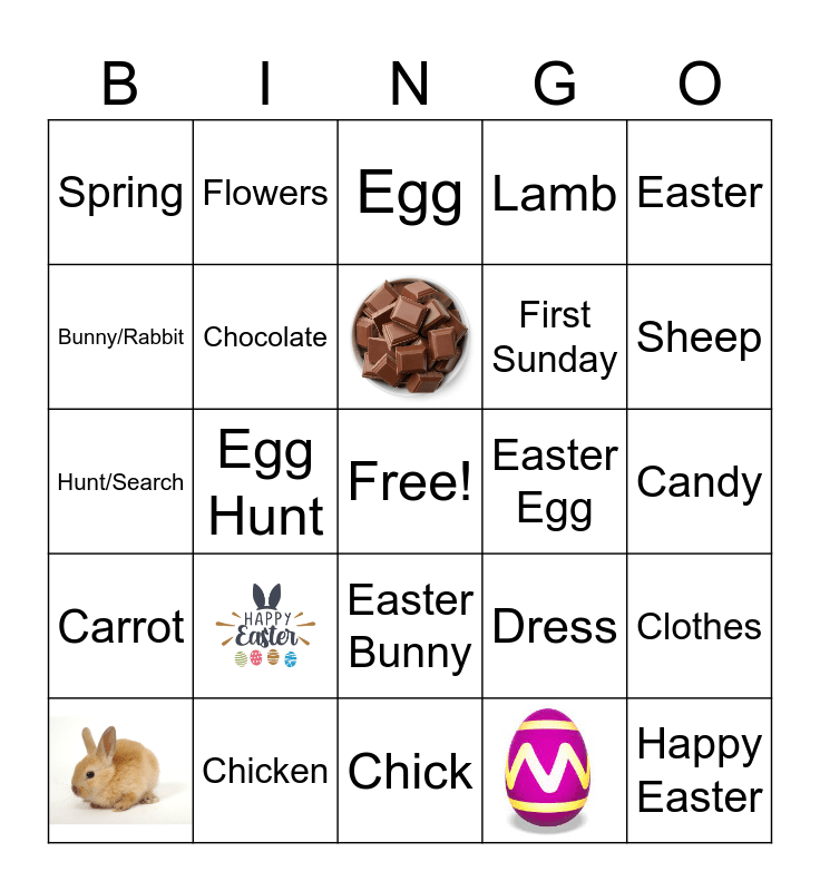 This bingo card has 4 images, a free space and 20 words: Easter, Spring, Flowers, Egg, Easter Egg, Candy, Hunt/Search, Chocolate, Dress, Clothes, Bunny/Rabbit, Chicken, Chick, Lamb, Sheep, Carrot, Egg Hunt, Easter Bunny, First Sunday and Happy Easter.