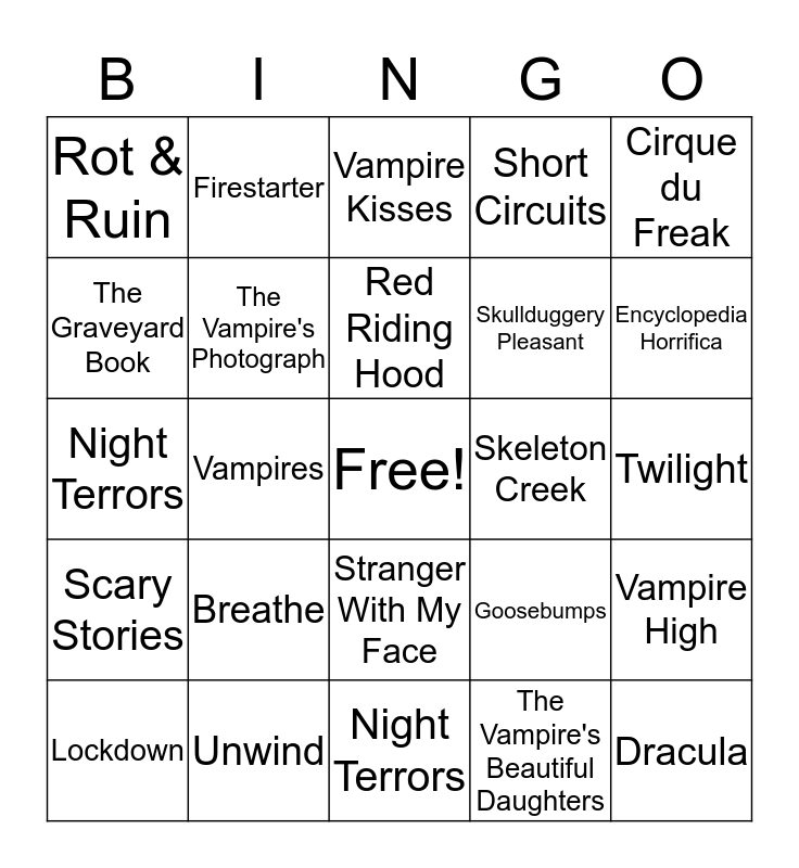 This bingo card has a free space and 24 words: Breathe, Unwind, Red Riding Hood, Lockdown, Cirque du Freak, Rot & Ruin, The Graveyard Book, Firestarter, Skeleton Creek, Stranger With My Face, Skullduggery Pleasant, Night Terrors, Goosebumps, Vampire High, The Vampire's Photograph, The Vampire's Beautiful Daughters, Twilight, Vampire Kisses, Encyclopedia Horrifica, Vampires, Dracula, Scary Stories, Short Circuits and Night Terrors.