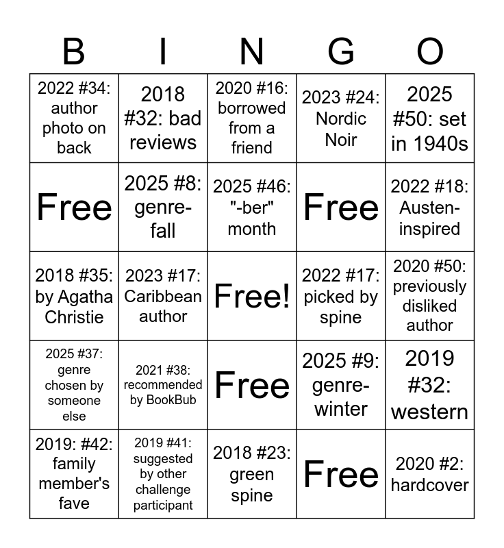 This bingo card has a free space and 36 words: 2025 #5: heist, 2025 #6: genre-spring, 2025 #7: genre-summer, 2025 #8: genre-fall, 2025 #9: genre-winter, 2025 #37: genre chosen by someone else, 2025 #46: "-ber" month, 2025 #49: volcano, 2025 #50: set in 1940s, 2024 #19: buddy read, 2023 #17: Caribbean author, 2023 #24: Nordic Noir, 2023 #47: Set in Dublin, 2022 #17: picked by spine, 2022 #18: Austen-inspired, 2022 #34: author photo on back, 2021 #21: by Kristin Hannah, 2021 #38: recommended by BookBub, 2020 #2: hardcover, 2020 #16: borrowed from a friend, 2020 #50: previously disliked author, 2019 #32: western, 2019 #41: suggested by other challenge participant, 2019: #42: family member's fave, 2018 #23: green spine, 2018 #32: bad reviews, 2018 #35: by Agatha Christie, Free, Free, Free, Free, Free, Free, Free, Free and Free.