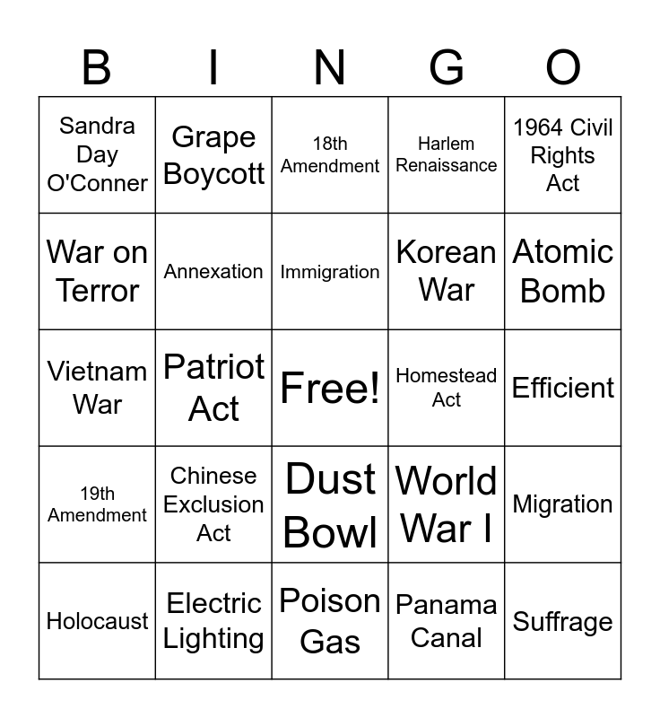 This bingo card has a free space and 29 words: Holocaust, Great Depression, Patriot Act, Regulation, Sandra Day O'Conner, 18th Amendment, Annexation, Chinese Exclusion Act, Homestead Act, Electric Lighting, Efficient, Suffrage, Poison Gas, Panama Canal, Atomic Bomb, Land Grant, Dust Bowl, 19th Amendment, 1964 Civil Rights Act, Vietnam War, World War I, World War II, Korean War, War on Terror, Harlem Renaissance, Grape Boycott, Migration, Immigration and Great Migration.