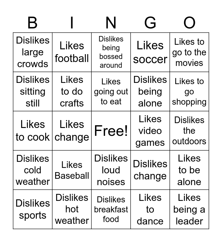 This bingo card has a free space and 24 words: Likes Baseball, Dislikes hot weather, Likes going out to eat, Dislikes sports, Likes to go to the movies, Dislikes large crowds, Dislikes sitting still, Likes football, Likes video games, Dislikes loud noises, Dislikes being alone, Likes to cook, Dislikes change, Likes to be alone, Likes to do crafts, Likes to dance, Dislikes the outdoors, Dislikes being bossed around, Likes to go shopping, Likes change, Likes being a leader, Dislikes cold weather, Likes soccer and Dislikes breakfast food.