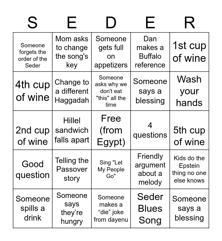 This bingo card has a free space and 29 words: Someone spills a drink, Haminados!, Hillel sandwich falls apart, Tell the Fascist china story, Someone forgets the order of the Seder, Someone gets full on appetizers, Change to a different Haggadah, Telling the Passover story, 4 questions, Someone says they’re hungry, 5th cup of wine, Someone says a blessing, Someone makes a “die” joke from dayenu, Seder Blues Song, Wash your hands, 4 children, Sing "Let My People Go", Good question, 1st cup of wine, 2nd cup of wine, Friendly argument about a melody, 3rd cup of wine, Someone says a blessing, 4th cup of wine, Dan makes a Buffalo reference, Mom asks to change the song's key, Kids do the Epstein thing no one else knows, Someone asks why we don't eat "this" all the time and Beni or Ed are mentioned.
