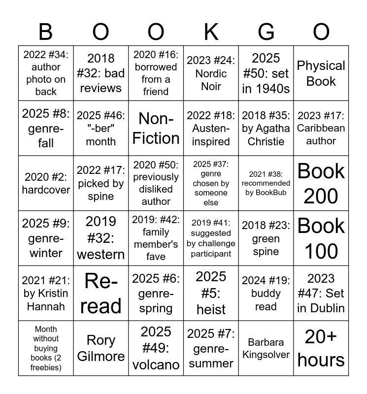 This bingo card has 36 words: 2025 #5: heist, 2025 #6: genre-spring, 2025 #7: genre-summer, 2025 #8: genre-fall, 2025 #9: genre-winter, 2025 #37: genre chosen by someone else, 2025 #46: "-ber" month, 2025 #49: volcano, 2025 #50: set in 1940s, 2024 #19: buddy read, 2023 #17: Caribbean author, 2023 #24: Nordic Noir, 2023 #47: Set in Dublin, 2022 #17: picked by spine, 2022 #18: Austen-inspired, 2022 #34: author photo on back, 2021 #21: by Kristin Hannah, 2021 #38: recommended by BookBub, 2020 #2: hardcover, 2020 #16: borrowed from a friend, 2020 #50: previously disliked author, 2019 #32: western, 2019 #41: suggested by challenge participant, 2019: #42: family member's fave, 2018 #23: green spine, 2018 #32: bad reviews, 2018 #35: by Agatha Christie, Rory Gilmore, Non-Fiction, Physical Book, 20+ hours, Month without buying books (2 freebies), Book 100, Book 200, Re-read and Barbara Kingsolver.
