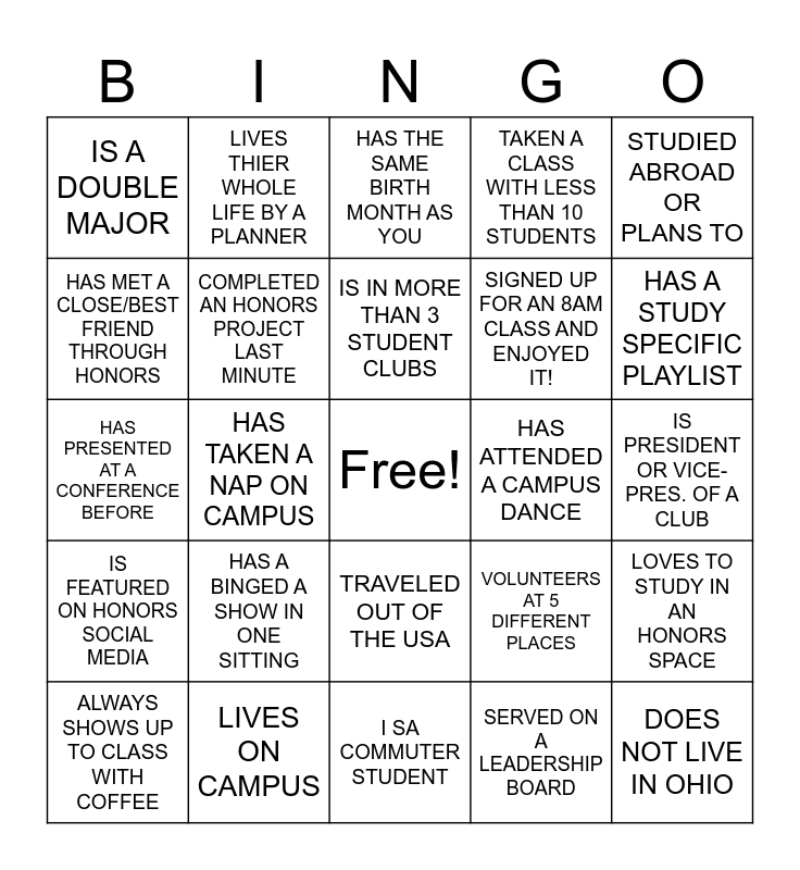 This bingo card has a free space and 26 words: TRAVELED OUT OF THE USA, SERVED ON A LEADERSHIP BOARD, IS IN MORE THAN 3 STUDENT CLUBS, LIVES ON CAMPUS, STUDIED ABROAD OR PLANS TO, IS A DOUBLE MAJOR, HAS MET A CLOSE/BEST FRIEND THROUGH HONORS, LIVES THIER WHOLE LIFE BY A PLANNER, IS PRESIDENT OR VICE-PRES. OF A CLUB, VOLUNTEERS AT 5 DIFFERENT PLACES, SIGNED UP FOR AN 8AM CLASS AND ENJOYED IT!, HAS PRESENTED AT A CONFERENCE BEFORE, LOVES TO STUDY IN AN HONORS SPACE, ALWAYS SHOWS UP TO CLASS WITH COFFEE, HAS TAKEN A NAP ON CAMPUS, TAKEN A CLASS WITH MORE THAN 300 STUDENTS, TAKEN A CLASS WITH LESS THAN 10 STUDENTS, IS FEATURED ON HONORS SOCIAL MEDIA, HAS THE SAME BIRTH MONTH AS YOU, DOES NOT LIVE IN OHIO, HAS A STUDY SPECIFIC PLAYLIST, I SA COMMUTER STUDENT, HAS ATTENDED A CAMPUS DANCE, HAS A BINGED A SHOW IN ONE SITTING, COMPLETED AN HONORS PROJECT LAST MINUTE and COMPLETED AN INTERNSHIP.