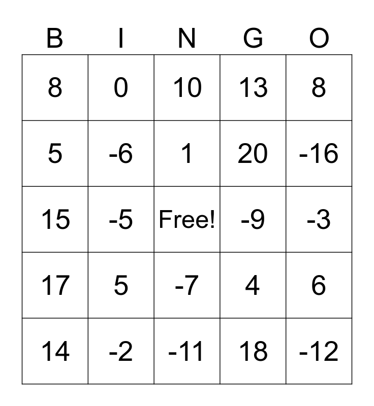 This bingo card has a free space and 24 words: 5, -2, 1, 14, 8, 8, 5, 0, -9, -7, 20, 15, 4, 6, -6, 18, -3, 10, -16, -5, -12, 17, 13 and -11.