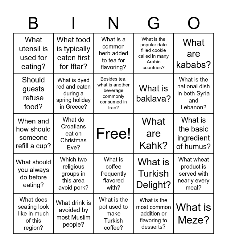 This bingo card has a free space and 24 words: What does seating look like in much of this region?, Which two religious groups in this area avoid pork?, Besides tea, what is another beverage commonly consumed in Iran?, What is the most common addition or flavoring to desserts?, What are kababs?, What utensil is used for eating?, What food is typically eaten first for Iftar?, What is a common herb added to tea for flavoring?, What are Kahk?, What is the basic ingredient of humus?, When and how should someone refill a cup?, What is dyed red and eaten during a spring holiday in Greece?, What is Turkish Delight?, What wheat product is served with nearly every meal?, Should guests refuse food?, What drink is avoided by most Muslim people?, What is the pot used to make Turkish coffee?, What is the popular date filled cookie called in many Arabic countries?, What is the national dish in both Syria and Lebanon?, What should you always do before eating?, What do Croatians eat on Christmas Eve?, What is coffee frequently flavored with?, What is baklava? and What is Meze?.