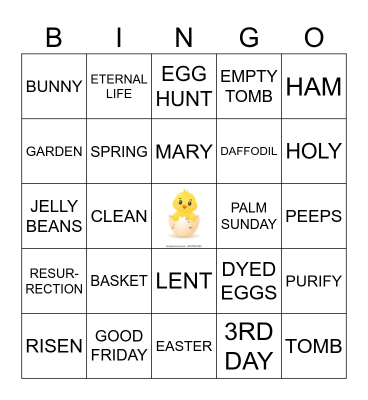 This bingo card has a free space and 29 words: RISEN, JESUS, CLEAN, RE-BIRTH, BUNNY, EGG HUNT, SPRING, BASKET, PALM SUNDAY, GOOD FRIDAY, PEEPS, TOMB, EASTER, 3RD DAY, HOLY, ASH WED., LENT, RESUR-RECTION, HAM, JELLY BEANS, DYED EGGS, CHOCO-LATE, DAFFODIL, GARDEN, EMPTY TOMB, ETERNAL LIFE, PURIFY, MARY and WHY WEEPEST THOU.
