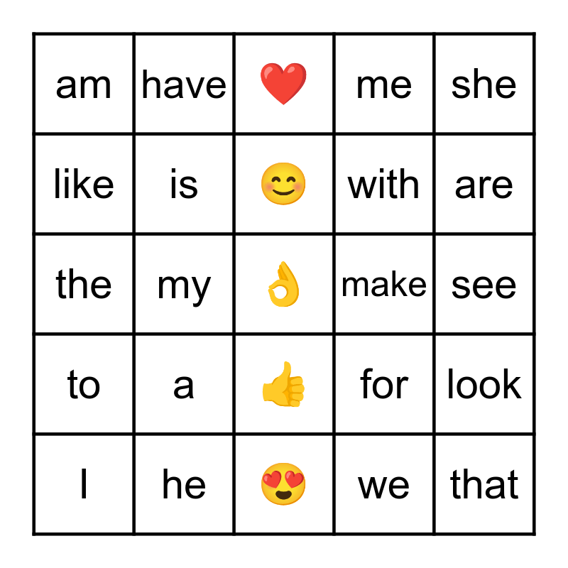 This bingo card has a free space and 24 words: I, a, 😊, we, she, am, have, ❤️, make, see, the, is, for, look, like, he, 😍, me, are, to, my, 👍, with and that.