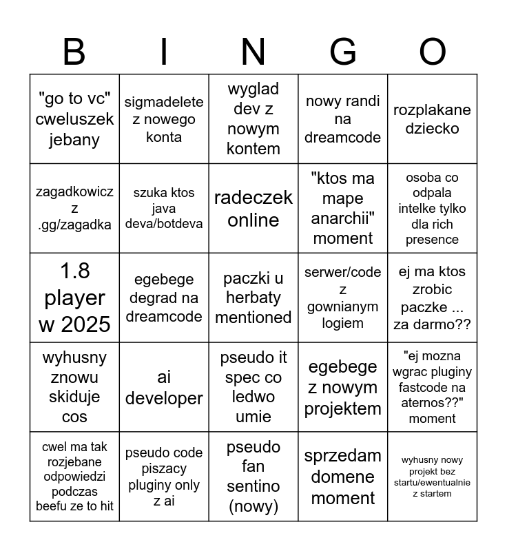 This bingo card has a free space and 24 words: ai developer, pseudo code piszacy pluginy only z ai, radeczek online, cwel ma tak rozjebane odpowiedzi podczas beefu ze to hit, rozplakane dziecko, "go to vc" cweluszek jebany, zagadkowicz z .gg/zagadka, sigmadelete z nowego konta, serwer/code z gownianym logiem, pseudo it spec co ledwo umie, "ktos ma mape anarchii" moment, 1.8 player w 2025, egebege z nowym projektem, "ej mozna wgrac pluginy fastcode na aternos??" moment, szuka ktos java deva/botdeva, sprzedam domene moment, ej ma ktos zrobic paczke ... za darmo??, wyglad dev z nowym kontem, osoba co odpala intelke tylko dla rich presence, egebege degrad na dreamcode, wyhusny nowy projekt bez startu/ewentualnie z startem, wyhusny znowu skiduje cos, nowy randi na dreamcode and pseudo fan sentino (nowy).