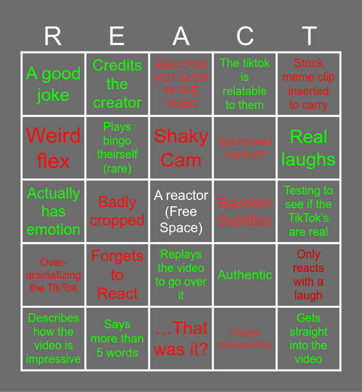 This bingo card has a free space and 24 words: Forgets to React, Says more than 5 words, Shaky Cam, Describes how the video is impressive, Stock meme clip inserted to carry, A good joke, Weird flex, Credits the creator, Random Subtitles, Replays the video to go over it, Sponsored "content", Actually has emotion, Authentic, Only reacts with a laugh, Plays bingo theirself (rare), Cringe commentary, Testing to see if the TikTok’s are real, REACTOR NOT EVEN IN THE VIDEO, Real laughs, Badly cropped, Gets straight into the video, Over-dramatizing the TikTok, The tiktok is relatable to them and …That was it?.