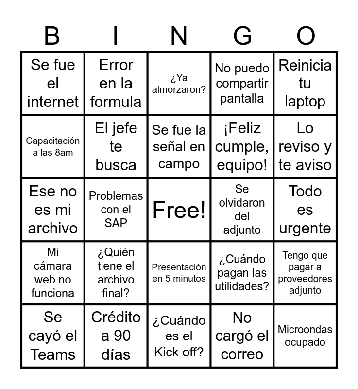 This bingo card has a free space and 25 words: Se cayó el Teams, ¿Quién tiene el archivo final?, Se fue la señal en campo, No cargó el correo, Lo reviso y te aviso, Se fue el internet, Error en la formula, ¿Ya almorzaron?, ¡Feliz cumple, equipo!, Tengo que pagar a proveedores adjunto, Ese no es mi archivo, El jefe te busca, ¿Cuándo pagan las utilidades?, Microondas ocupado, Capacitación a las 8am, Crédito a 90 días, ¿Cuándo es el Kick off?, No puedo compartir pantalla, Todo es urgente, Mi cámara web no funciona, Problemas con el SAP, Presentación en 5 minutos, Se olvidaron del adjunto, Reinicia tu laptop and WhatsApp fuera de conexión.