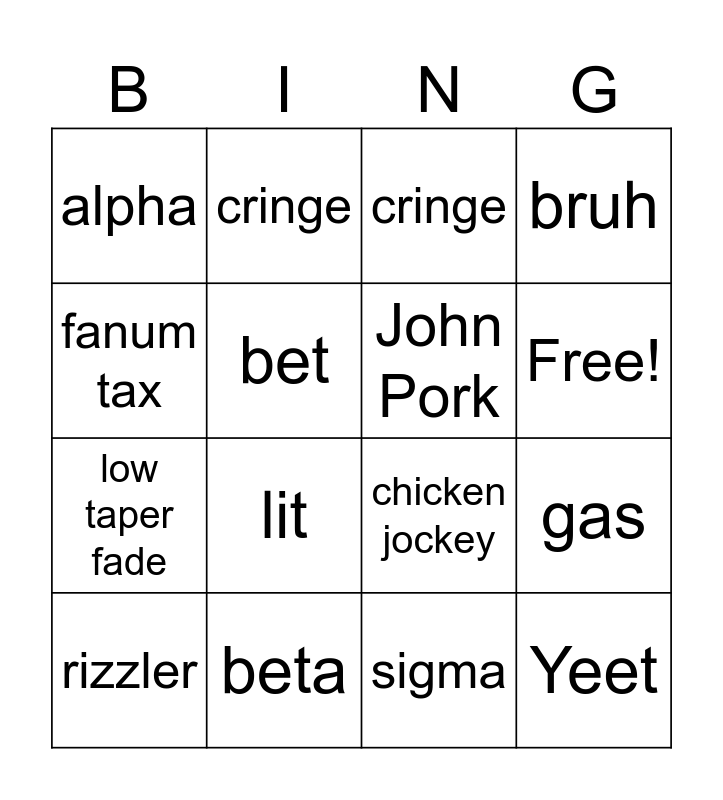 This bingo card has 17 words: sigma, rizzler, cringe, alpha, lit, bruh, gas, John Pork, Free!, bet, beta, chicken jockey, fanum tax, cringe, low taper fade, Bussin' and Yeet.