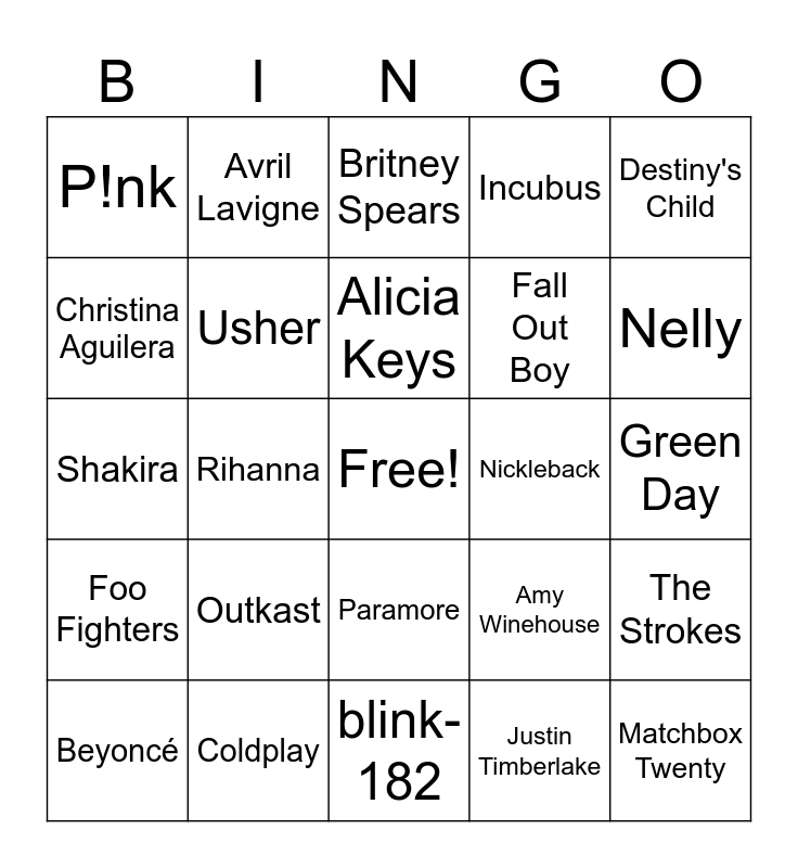 This bingo card has a free space and 24 words: Outkast, Coldplay, Alicia Keys, Beyoncé, Destiny's Child, P!nk, Christina Aguilera, Avril Lavigne, Nickleback, Paramore, Fall Out Boy, Shakira, Amy Winehouse, The Strokes, Usher, Justin Timberlake, Green Day, Britney Spears, Nelly, Rihanna, Matchbox Twenty, Foo Fighters, Incubus and blink-182.