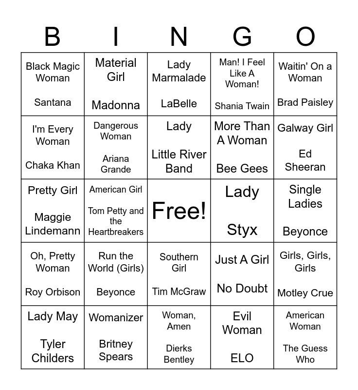 This bingo card has a free space and 59 words: Busy Woman Sabrina Carpenter, Womanizer Britney Spears, Redneck Woman Gretchen Wilson, Oh, Pretty Woman Roy Orbison, Evil Woman ELO, Long Cool Woman The Hollies, Dangerous Woman Ariana Grande, Witchy Woman Eagles, More Than A Woman Bee Gees, L.A. Woman The Doors, Man! I Feel Like A Woman! Shania Twain, Louisiana Woman, Mississippi Man Conway Twitty, Loretta Lynn, I'm Every Woman Chaka Khan, I've Got A Woman Ray Charles, (You Make Me Feel Like) A Natural Woman Aretha Franklin, Black Magic Woman Santana, American Woman The Guess Who, Waitin' On a Woman Brad Paisley, Honky Tonk Women The Rolling Stones, Lady Little River Band, Lady Styx, Lady Marmalade LaBelle, Lady May Tyler Childers, Girls, Girls, Girls Motley Crue, Girls Just Want To Have Fun Cyndi Lauper, Beautiful Girls Sean Kingston, Brown Eyed Girl Van Morrison, Uptown Girl Billy Joel, Galway Girl Ed Sheeran, Steal My Girl One Direction, Only Girl (In The World) Rihanna, My Girl The Temptations, Barbie Girl Aqua, Rich Girl Hall & Oates, Material Girl Madonna, Girls Like You Maroon 5, Jessie's Girl Rick Springfield, American Girl Tom Petty and the Heartbreakers, It Girl Jason Derulo, Pretty Girl Maggie Lindemann, Girls Beastie Boys, Run the World (Girls) Beyonce, Single Ladies Beyonce, My Kind of Woman Mac DeMarco, Are You Gonna Be My Girl Jet, When You're In Love With A Beautiful Woman Dr. Hook, Outlaw Women Hank Williams, Jr., Good Time Women The Rolling Stones, Southern Girl Tim McGraw, Woman, Amen Dierks Bentley, Ladies Love Country Boys Trace Adkins, Chicks Dig It Chris Cagle, Gimmie That Girl Joe Nichols, Let There Be Cowgirls Chris Cagle, Good Girls Go Bad Cobra Starship, Just A Girl No Doubt, Gold Dust Woman Fleetwood Mac, Fat Bottomed Girls Queen and Trashy Women Confederate Railroad.