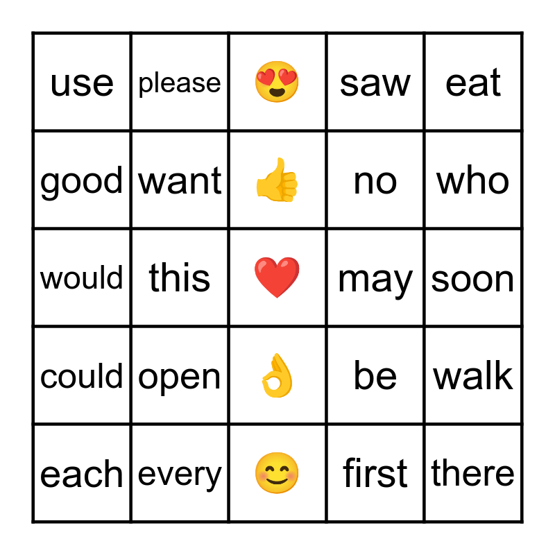 This bingo card has a free space and 24 words: each, open, 👍, first, eat, use, please, 😍, may, soon, would, want, be, walk, good, every, 😊, saw, who, could, this, 👌, no and there.