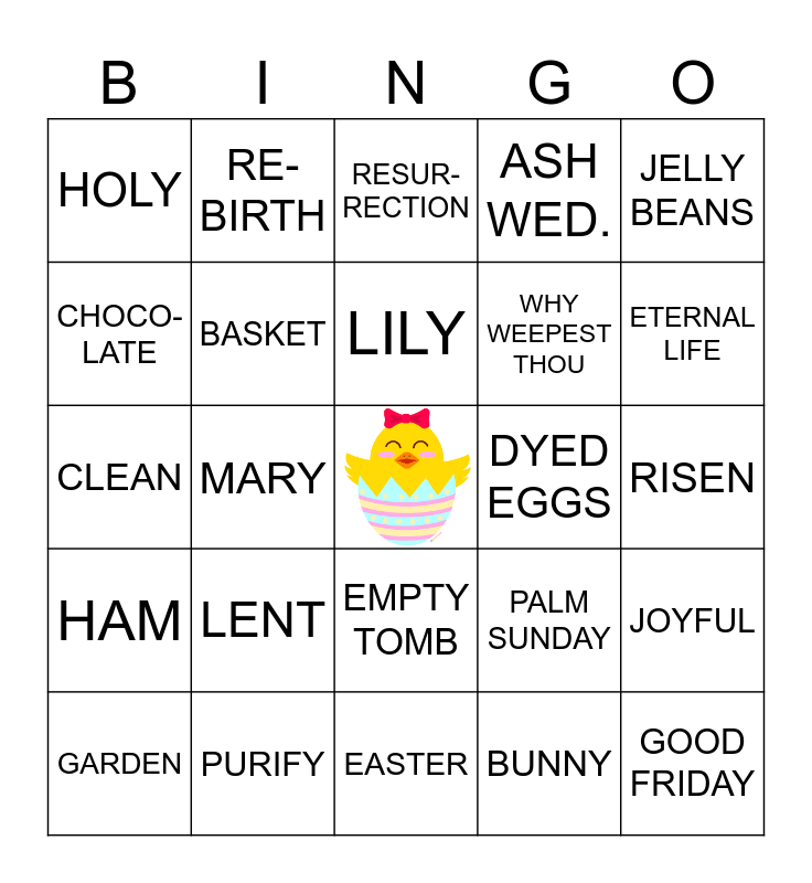 This bingo card has a free space and 29 words: GARDEN, SPRING, MARY, DAFFODIL, HOLY, RESUR-RECTION, BASKET, LENT, DYED EGGS, PURIFY, RISEN, GOOD FRIDAY, EASTER, BUNNY, ETERNAL LIFE, EGG HUNT, EMPTY TOMB, HAM, JELLY BEANS, CLEAN, PALM SUNDAY, PEEPS, WHY WEEPEST THOU, CHOCO-LATE, ASH WED., RE-BIRTH, JOYFUL, LILY and 3RD DAY.