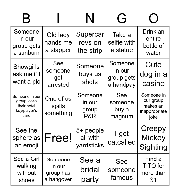 This bingo card has a free space and 24 words: Free!, Someone in our group has a hangover, Someone buys us shots, See a Girl walking without shoes, Drink an entire bottle of water, Someone in our group gets a sunburn, Showgirls ask me if I want a pic, Old lady hands me a slapper, See someone buy a magnum, 5+ people all with yardsticks, Someone in our group gets a handpay, Someone in our group loses their hotel key/player’s card, I get catcalled, Creepy Mickey Sighting, See someone get arrested, See someone famous, Someone in our group makes an inappropriate joke, Supercar revs on the strip, Cute dog in a casino, One of us spills something, Find a TITO for more than $1, See the sphere as an emoji, Take a selfie with a statue and See a bridal party.