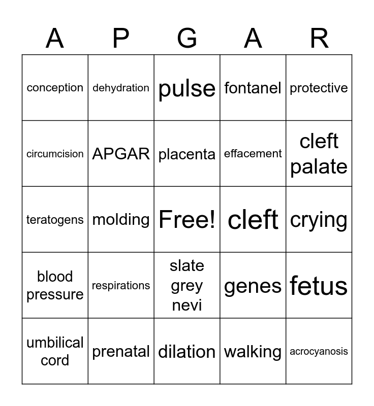 This bingo card has a free space and 28 words: chromosomes, prenatal, placenta, walking, protective, conception, APGAR, dilation, cleft, fetus, teratogens, molding, genes, acrocyanosis, circumcision, uterine, slate grey nevi, fontanel, cleft palate, umbilical cord, dehydration, rest, effacement, crying, blood pressure, respirations, pulse and lip.