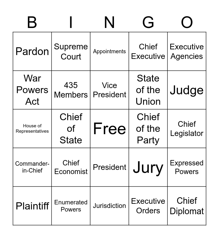 This bingo card has a free space and 40 words: Bicameral, House of Representatives, Senate, 435 Members, Enumerated Powers, President, Vice President, Cabinet, Executive Agencies, Commander-in-Chief, Chief of State, Chief Executive, Chief Diplomat, Chief Legislator, Chief of the Party, Chief Economist, Veto, Pardon, Treaty, Appointments, Expressed Powers, Executive Orders, State of the Union, War Powers Act, 35 Years Old, Natural-Born Citizen, 14-Year Resident, Senate Confirmation, Judicial Branch, Criminal Trial, Civil Trial, Plaintiff, Defendant, Jury, Judge, Jurisdiction, Judicial Review, Marbury v. Madison, Supreme Court and Appeal.