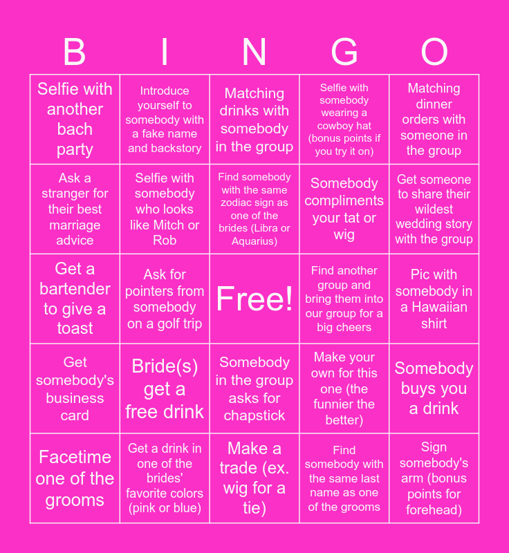 This bingo card has a free space and 24 words: Bride(s) get a free drink, Get a drink in one of the brides' favorite colors (pink or blue), Find somebody with the same zodiac sign as one of the brides (Libra or Aquarius), Facetime one of the grooms, Matching dinner orders with someone in the group, Selfie with another bach party, Ask a stranger for their best marriage advice, Introduce yourself to somebody with a fake name and backstory, Find another group and bring them into our group for a big cheers, Somebody in the group asks for chapstick, Somebody compliments your tat or wig, Get a bartender to give a toast, Make your own for this one (the funnier the better), Somebody buys you a drink, Selfie with somebody who looks like Mitch or Rob, Find somebody with the same last name as one of the grooms, Pic with somebody in a Hawaiian shirt, Matching drinks with somebody in the group, Get someone to share their wildest wedding story with the group, Ask for pointers from somebody on a golf trip, Sign somebody's arm (bonus points for forehead), Get somebody's business card, Selfie with somebody wearing a cowboy hat (bonus points if you try it on) and Make a trade (ex. wig for a tie).
