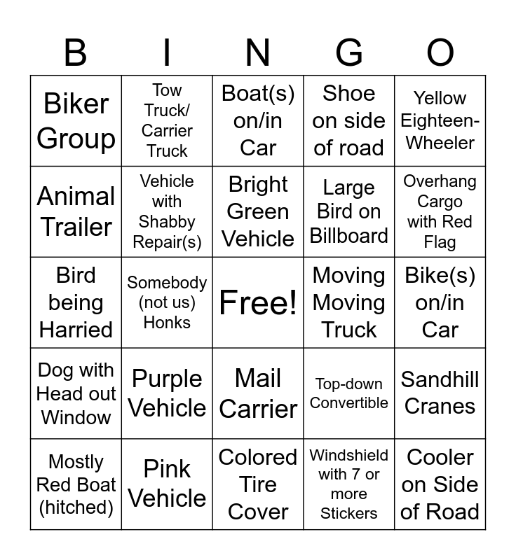 This bingo card has a free space and 24 words: Purple Vehicle, Pink Vehicle, Bright Green Vehicle, Mostly Red Boat (hitched), Yellow Eighteen-Wheeler, Biker Group, Animal Trailer, Tow Truck/ Carrier Truck, Moving Moving Truck, Mail Carrier, Large Bird on Billboard, Bird being Harried, Top-down Convertible, Sandhill Cranes, Vehicle with Shabby Repair(s), Windshield with 7 or more Stickers, Bike(s) on/in Car, Boat(s) on/in Car, Overhang Cargo with Red Flag, Somebody (not us) Honks, Cooler on Side of Road, Dog with Head out Window, Shoe on side of road and Colored Tire Cover.