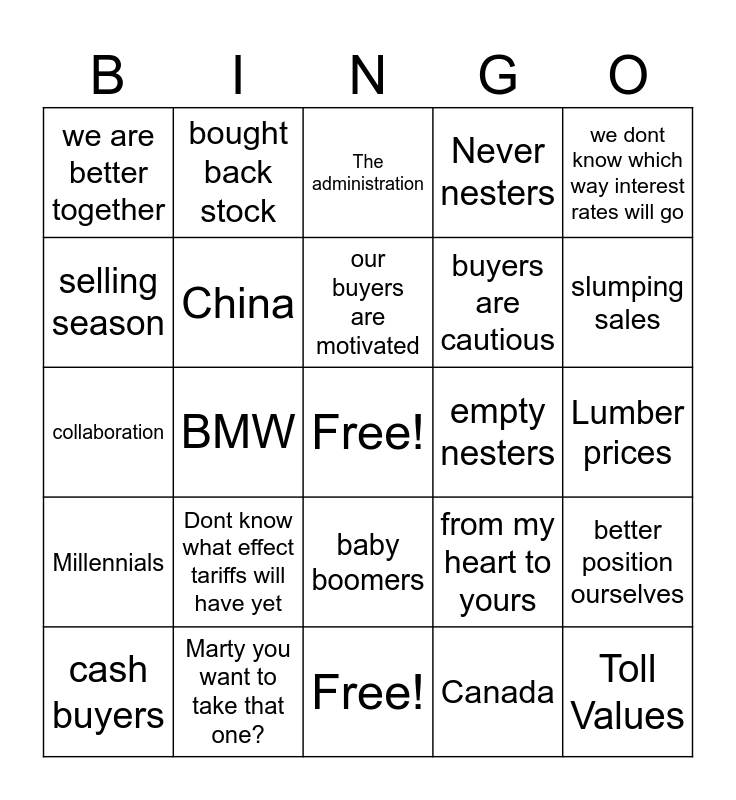 This bingo card has a free space and 24 words: Dont know what effect tariffs will have yet, Marty you want to take that one?, our buyers are motivated, cash buyers, we dont know which way interest rates will go, we are better together, selling season, bought back stock, empty nesters, baby boomers, buyers are cautious, collaboration, from my heart to yours, better position ourselves, China, Canada, Lumber prices, The administration, slumping sales, BMW, Toll Values, Millennials, Never nesters and Free!.