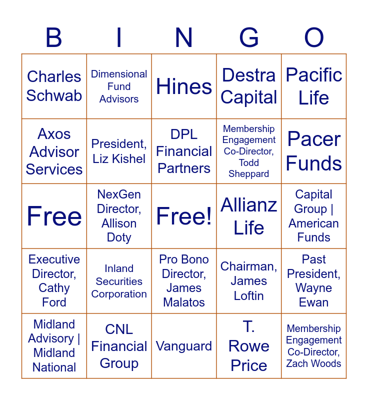 This bingo card has a free space and 24 words: Midland Advisory | Midland National, Inland Securities Corporation, DPL Financial Partners, T. Rowe Price, Pacific Life, Charles Schwab, Dimensional Fund Advisors, Hines, Allianz Life, Capital Group | American Funds, Free, President, Liz Kishel, Chairman, James Loftin, Past President, Wayne Ewan, Axos Advisor Services, CNL Financial Group, Vanguard, Destra Capital, Pacer Funds, Executive Director, Cathy Ford, NexGen Director, Allison Doty, Pro Bono Director, James Malatos, Membership Engagement Co-Director, Todd Sheppard and Membership Engagement Co-Director, Zach Woods.