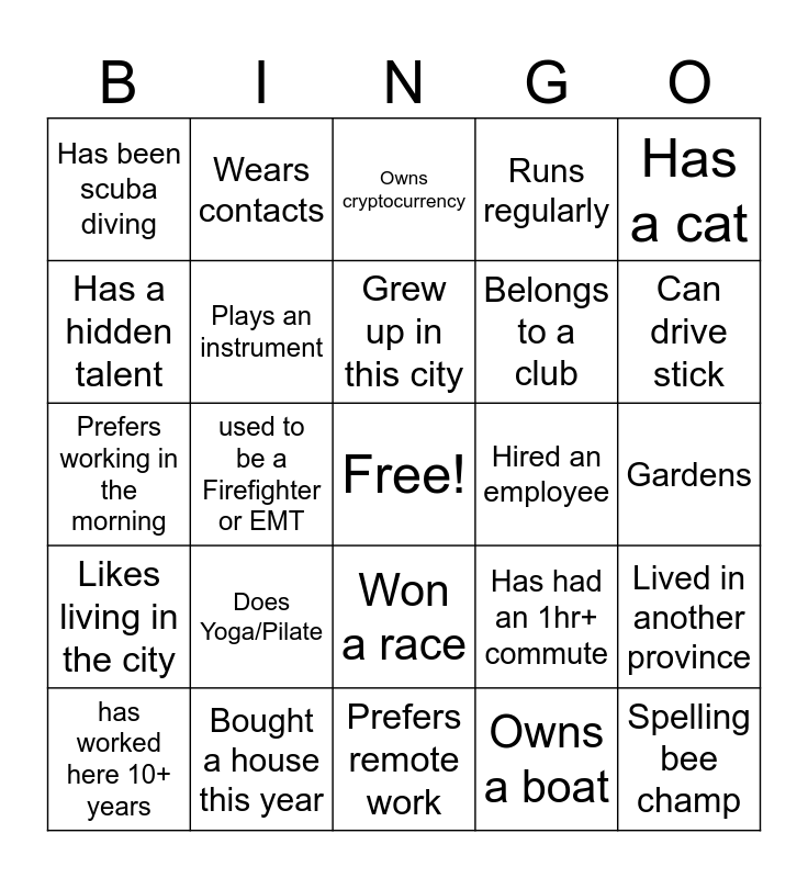 This bingo card has a free space and 100 words: From the west coast, Buys lunch every day, Gardens, Child of immigrants, Has a big backyard, Going on vacation soon, Is left-handed, Hand-made an outfit, Good at interviews, Lives near a coffee shop, From the east coast, Went viral online, Does stand up comedy, Bought a house this year, Attended high school reunion, Drinks 2+ cups coffee a day, Belongs to a club, Uses a paper planner, Has taken kid to work, Has an unusual hobby, Likes pineapple on pizza, Proposed to spouse in public, Became debt-free this year, Comes from a big family, Owns a gaming computer, Hired an employee, Has a cat, Has had an 1hr+ commute, Loves roller coasters, Started a club, used to be a Firefighter or EMT, Has been scuba diving, Double-jointed, Same birth month as you, Owns a boat, Grew up in this city, Lived in another province, Mentioned by name in good review, Was in a wedding party this year, Attended a concert this year, Appeared in a movie, Been on a bad blind date, Prefers working in the morning, Digital nomad, Can drive stick, Owns cryptocurrency, From the North, Carpools, Had a long-distance relationship, Prefers remote work, In a sports league, From the Atlantic, Part of a professional group, Has food allergies, Works out before work, Has a tattoo, Got married this year, Has been skydiving, Built an app, Runs regularly, Had a baby this year, Read 10+ books this year, Lives in a rural area, Mixologist, Collects something, Makes New Year’s resolutions, This is their first job, Knows martial arts, Can do basic car repairs, Traveled in the last year, Led a project, Does Yoga/Pilate, From The Prairie, Listens to podcasts, Has a snack stash, Good at escape rooms, Has worked here <1 year, Has a hidden talent, Bad at interviews, Loves scary movies, Has 0 unread emails, Spelling bee champ, Has a dog, Won a race, Been to Disney this year, Wears contacts, Love to travel, Won at a casino, Received an award, Likes living in the city, Helped a stranger, Watches documentaries, Sends Christmas cards, has worked here 10+ years, Plays an instrument, Lives with roommates, Took a how-to class recently, Loves karaoke, Played prank on a coworker and Can hula hoop.