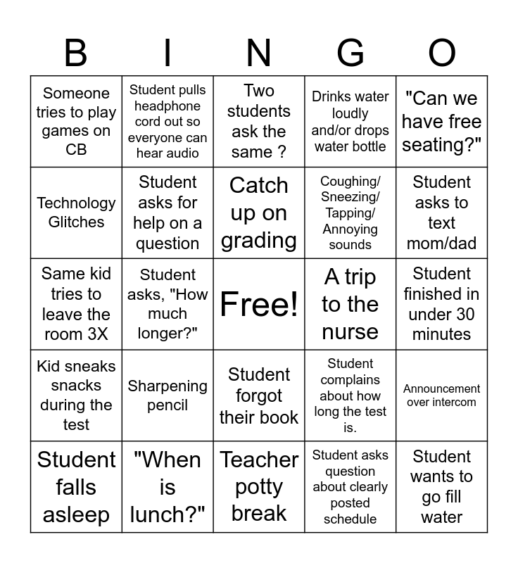 This bingo card has a free space and 29 words: Student falls asleep, Tardy student, Student asks, "How much longer?", Chromebook not charged, Someone tries to play games on CB, Two students ask the same ?, Student asks for help on a question, Sharpening pencil, A trip to the nurse, "When is lunch?", Student finished in under 30 minutes, Student wants to go fill water, Teacher potty break, Student asks question about clearly posted schedule, Student asks to text mom/dad, Student asks to go to bathroom, Student forgot their book, Kid sneaks snacks during the test, "Can we have free seating?", Same kid tries to leave the room 3X, Student complains about how long the test is., You brought coffee/ snacks, Coughing/ Sneezing/ Tapping/ Annoying sounds, Technology Glitches, Drinks water loudly and/or drops water bottle, Student pulls headphone cord out so everyone can hear audio, Announcement over intercom, Catch up on grading and Test not loading.