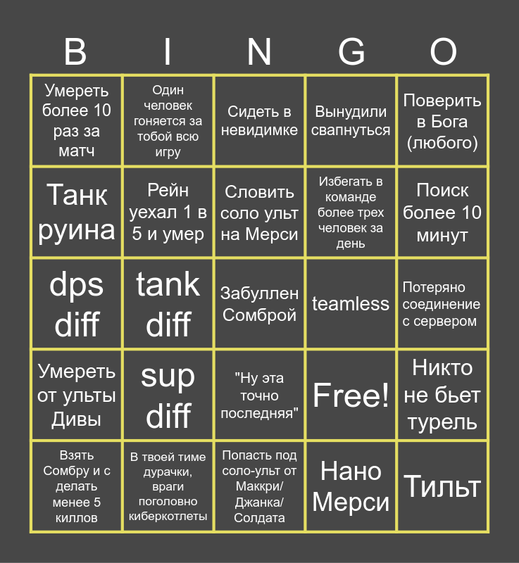 This bingo card has 25 words: sup diff, Попасть под соло-ульт от Маккри/Джанка/Солдата, Словить соло ульт на Мерси, Взять Сомбру и с делать менее 5 киллов, Поверить в Бога (любого), Умереть более 10 раз за матч, Танк руина, Один человек гоняется за тобой всю игру, teamless, "Ну эта точно последняя", Избегать в команде более трех человек за день, dps diff, Free!, Никто не бьет турель, Рейн уехал 1 в 5 и умер, Тильт, Потеряно соединение с сервером, Сидеть в невидимке, Поиск более 10 минут, tank diff, Забуллен Сомброй, В твоей тиме дурачки, враги поголовно киберкотлеты, Умереть от ульты Дивы, Вынудили свапнуться and Нано Мерси.