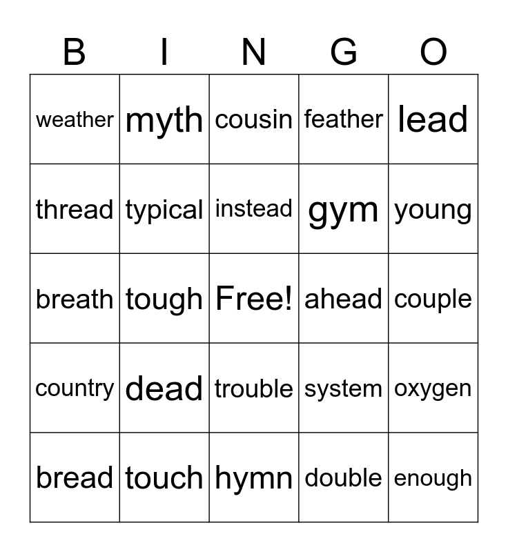 This bingo card has a free space and 24 words: dead, touch, instead, bread, lead, weather, thread, myth, ahead, trouble, gym, breath, system, oxygen, typical, double, couple, cousin, young, tough, enough, country, feather and hymn.